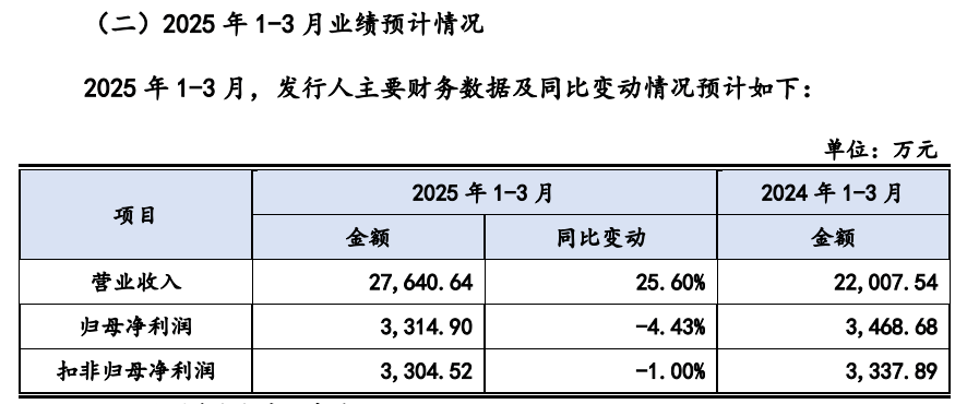 正在最新披露的招股书(2025-04-14)中,同宇新材披露的业绩估计环境显示,2025年1-3月,公司“增收不增利”,营收增25。6%但净利降4。43%,反差较着。